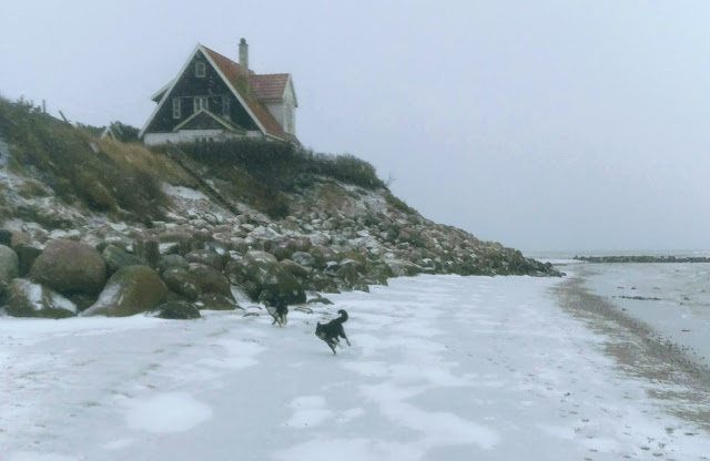 Vi får sjældent så meget sne heroppe i det nordsjællandske som resten af landet, men i eftermiddag blev det da liggende. Ved stranden ved Nødebo Huse er der et skønt stykke at løbe på og i dag var der ikke andre end os, så hundene fik frie tøjler og nød det!